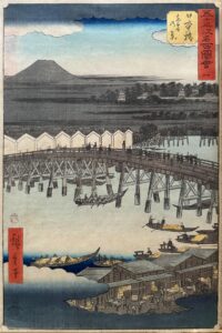 - Hiroshige Andō (1797-1858), No.1 Nihonbashi: View of Dawn Clouds from the series Famous Sights of the Fifty-three Stations of the Tōkaidō (GojūSanTsugi-MeishoZu’e), c. 1855 (late 20th century printing). Color woodblock print. Collection of Lindsey and Carolyn Echelbarger.